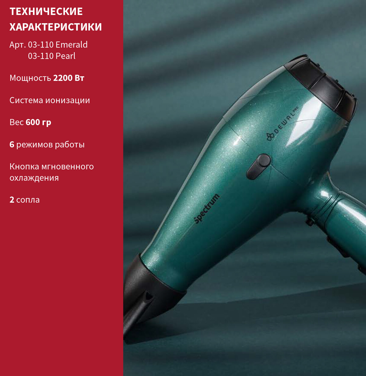 Фен DEWAL PRO SPECTRUM с ионизацией, изумрудный, вес 600 гр, 2200 Вт, 2 насадки, провод 3 м 03-110 Emerald