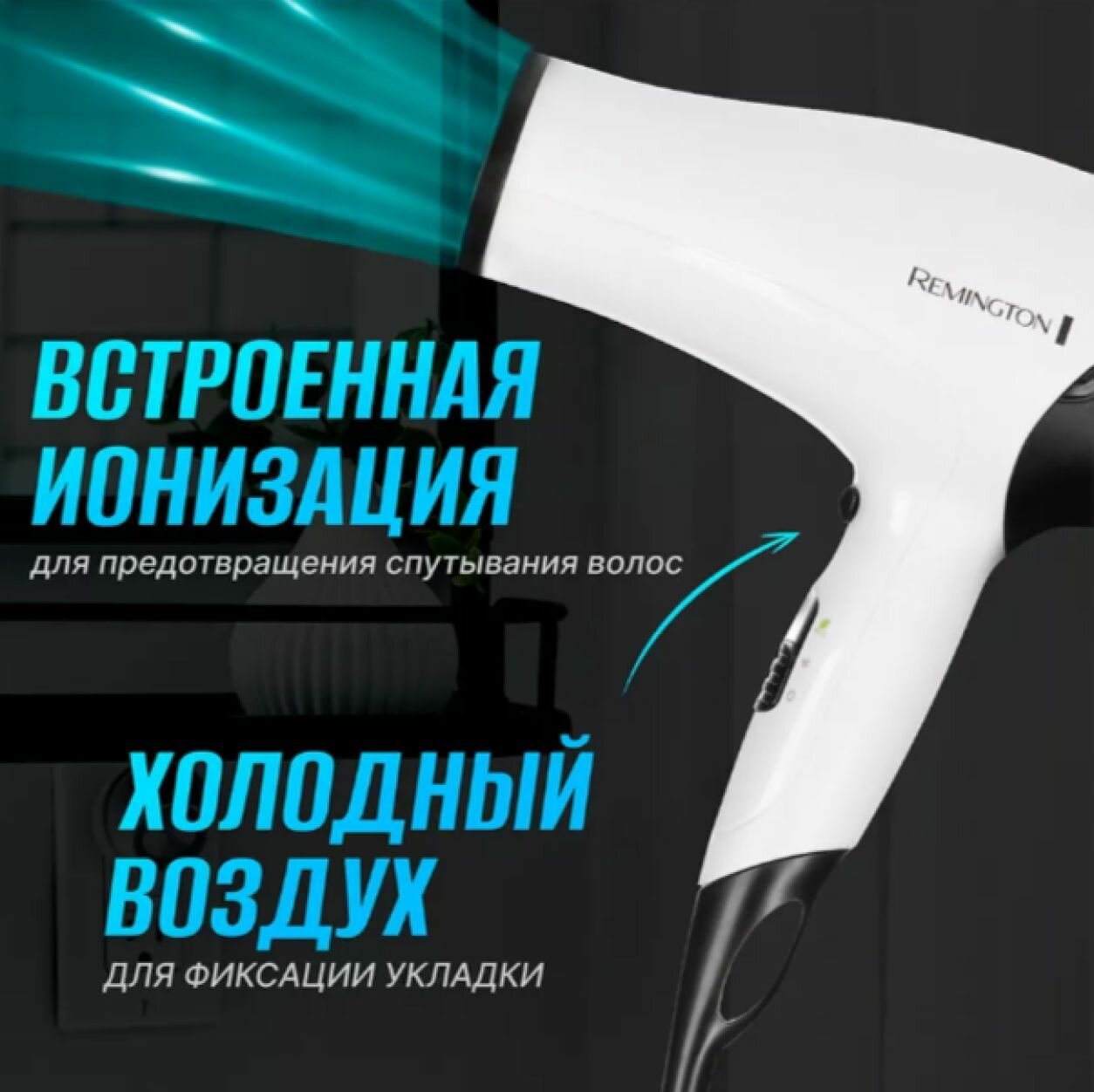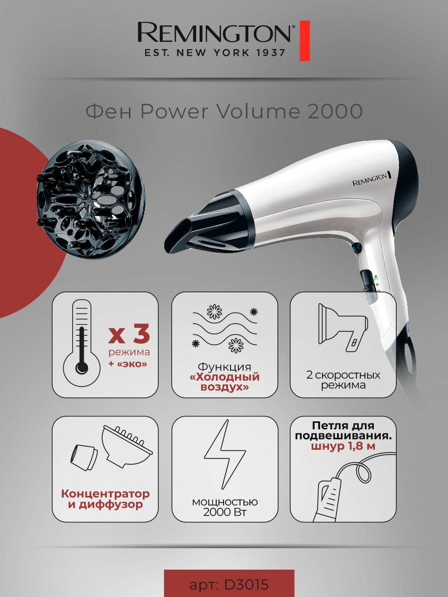 Купить Фен для волос Remington Power Volume 2000 D3015, керамическая решетка, концентратор и диффузор, 2000 Вт, 3 температурных 2 скоростных режима