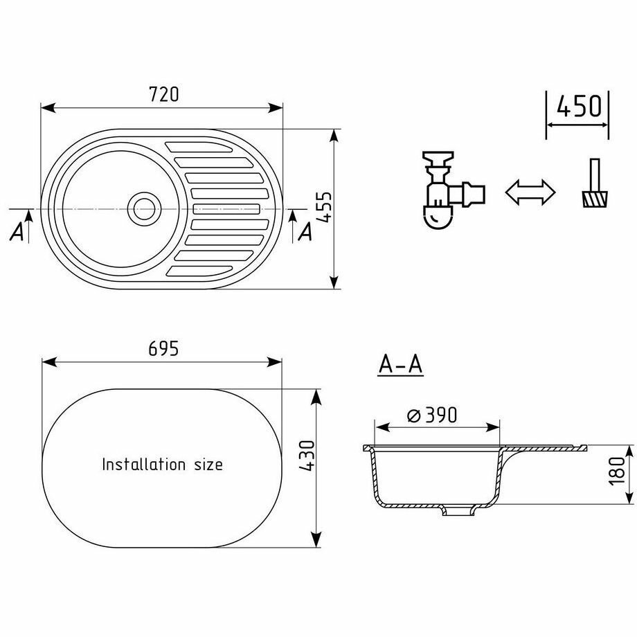 Мойка Ulgran, мрамор, U-107-308, (720*455*180 мм), черный, сифон и сливная арматура