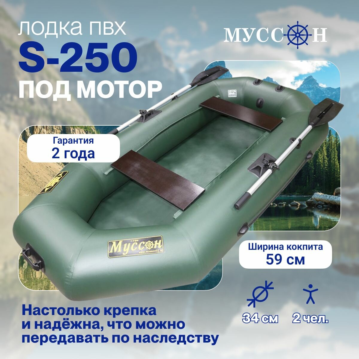 Лодка ПВХ надувная для рыбалки Муссон S-250 / зеленая