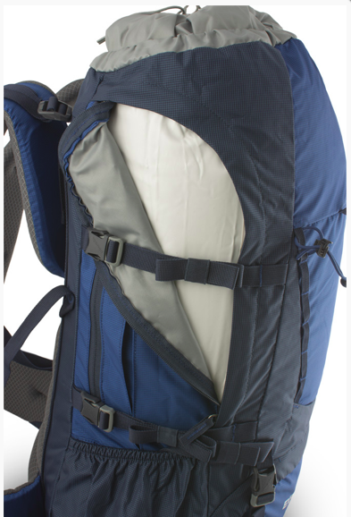 Большое кол-вор утяжек, креплений, разместить навесное не составляет особых проблем. объемные боковые карманы литрово по 10-12 каждый, плюс кармашки у самого днища (спокойно по 1,5 литра влазит с каждой стороны). Нижний вход - не знаю, многие относят его к достоинствам, по мне так не нужная штука, ибо на стоянке рюкзак как правило целиком распаковывается, а веетровки/флиски прекрасно в боковые карманы залазят либо верхний клапан либо резинку по центру Резинка по центру для крепления - за 3 года до сих пор не потеряла своих свойств, не растянулась Хорошо распределяет вес |