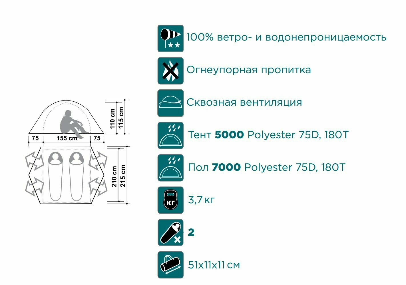По размеру - честная "двушка", двум людям не самой скромной комплекции в ней не тесно. Правда, если рост от 180см., думаю, может быть неуютно. Палатка нормально стоит на ветру, легко выдерживает дождь часа на 3-4 (дольше не было случая проверить),в конденсате просыпаться за две с небольшим недели тоже не пришлось. В заднем тамбуре легко помещается пара средних рюкзаков, но рюкзаки 90+ литров, скорее всего, уместить будет сложно. Лично мне очень нравится то, что пол не из армированного полиэтилена - в этом классе не так часто встречается. Главный недостаток - вес. Подобные палатки обычно на полкило, а то и на килограмм легче. Но тут уже, видимо, вопрос цены. Ещё не понравилось отсутствие верхней полки для вещей - с ней было бы удобнее. Ну и нитки из швов внутренней палатки слегка лезут, увы. В целом - хорошо, но вот как трекинговую ее использовать точно не стоит. |