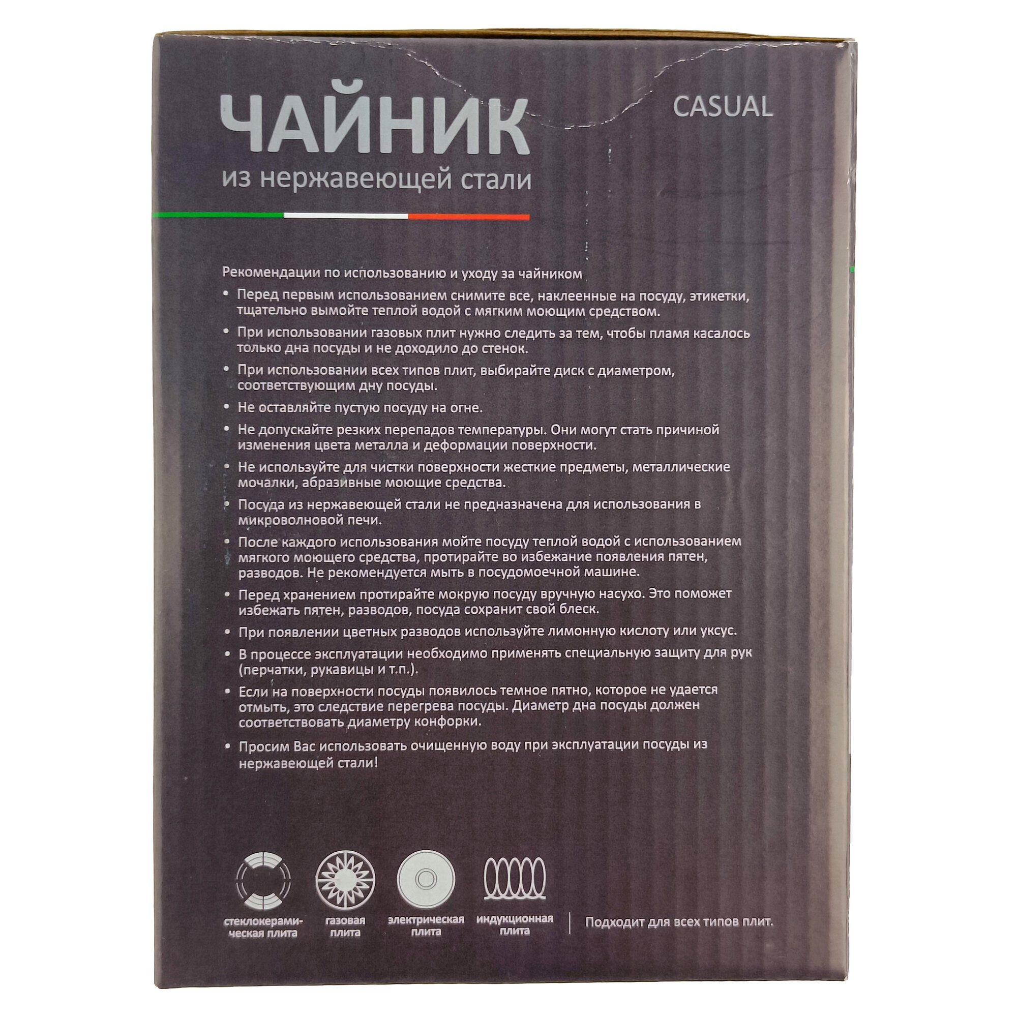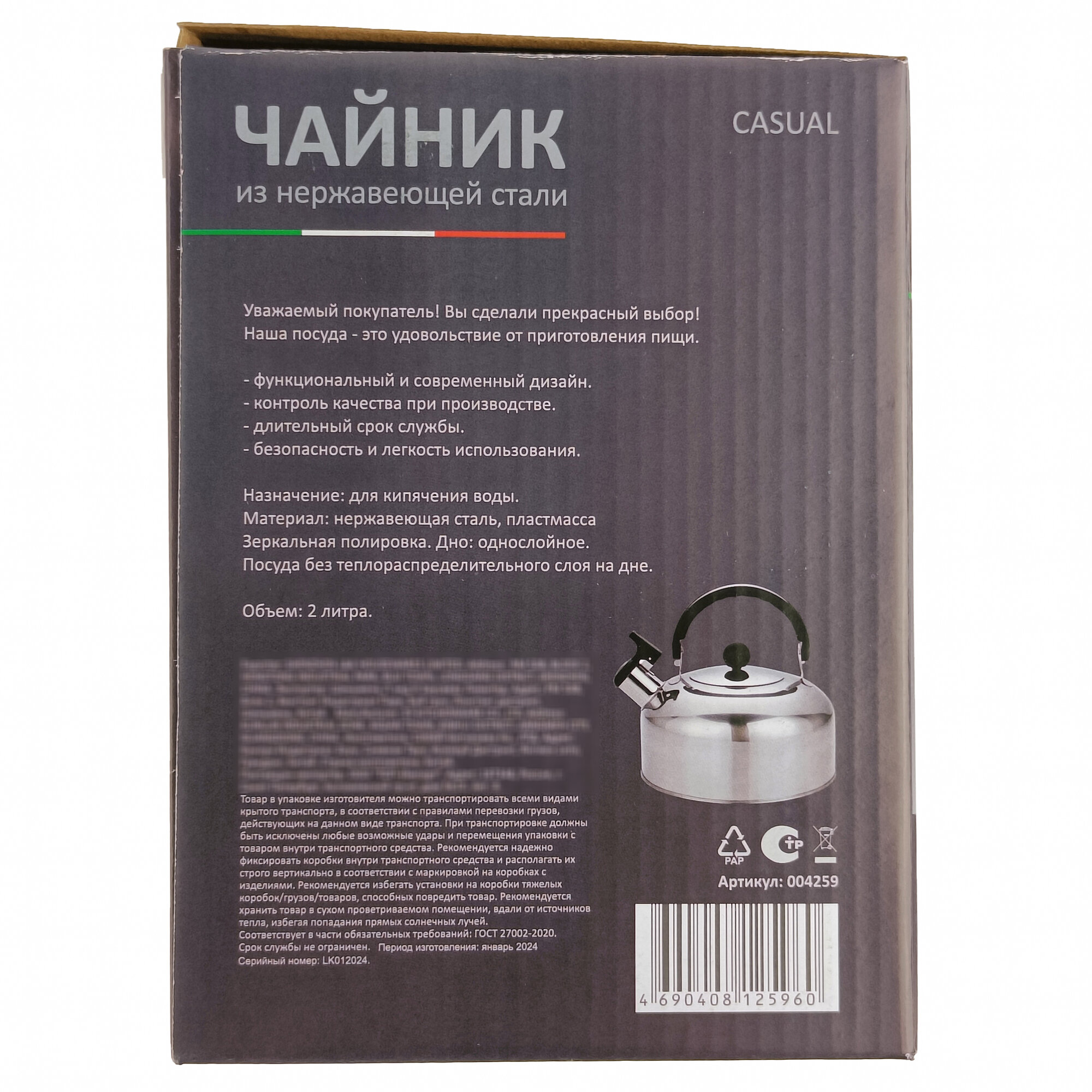 | Комплектация | 1 шт. Чайник Casual, объем 2 л, из нерж стали со свистком, зеркальная полировка, без тм 004259 Без ТМ |