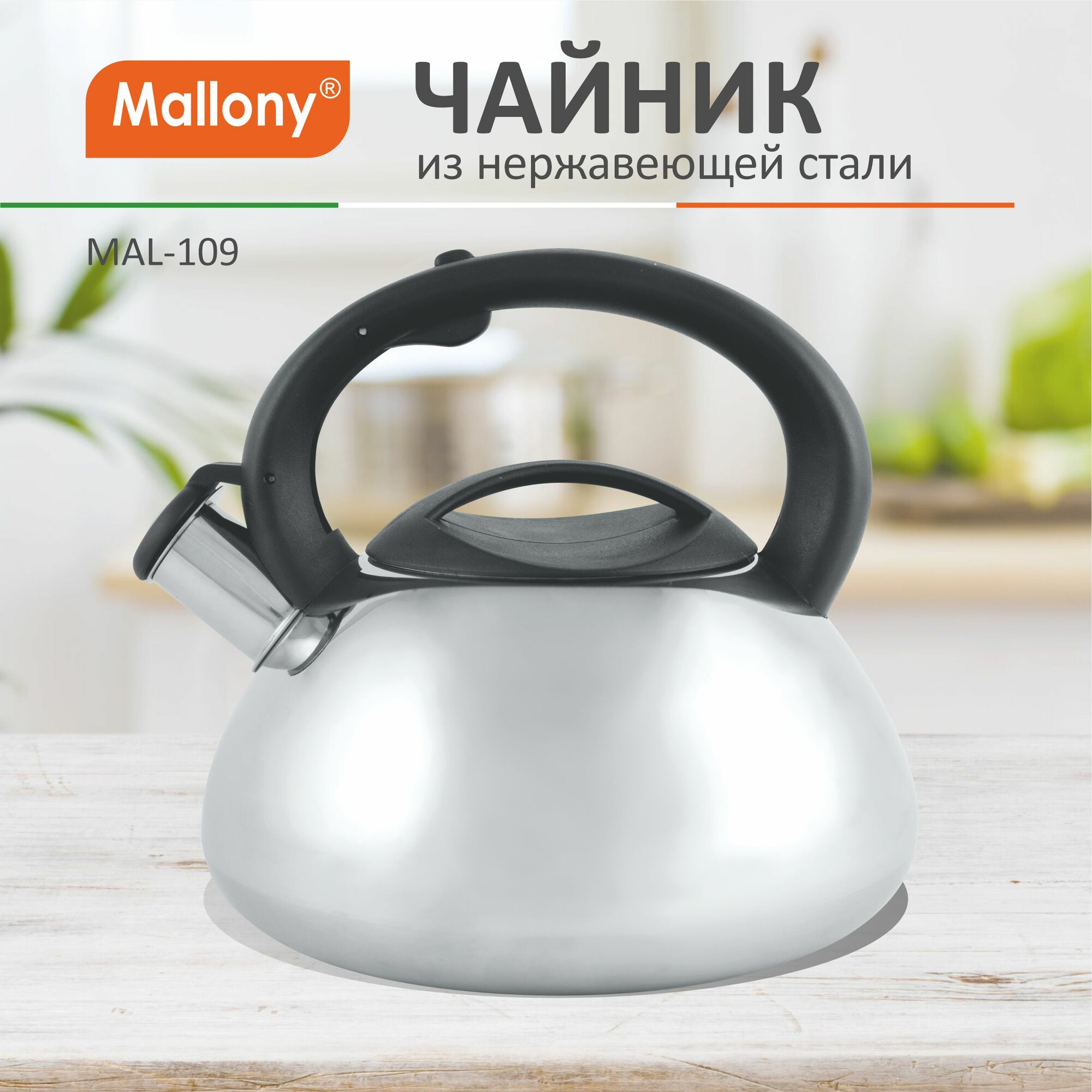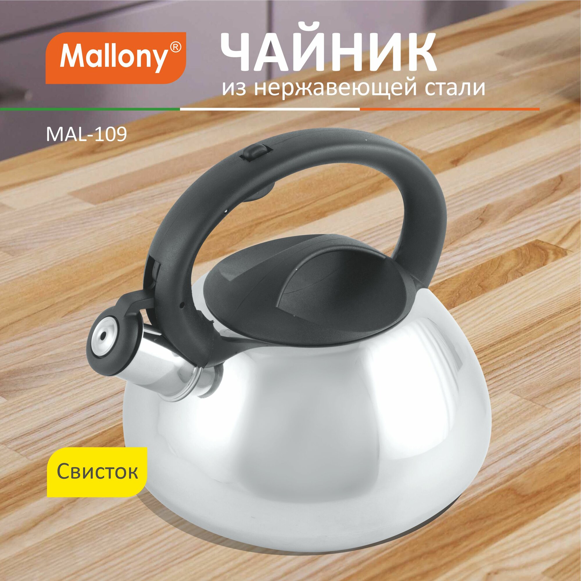 Чайник со свистком Mallony MAL-109, 3.0л, нержавеющая сталь (цельнометаллический, капсулир.дно, ручка пластик, полированный) (910071)