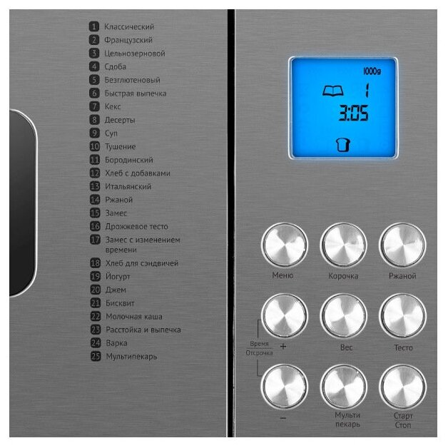 25 предустановленных программ, окошко для отслеживания выпечки, румяная корочка, вымешивание и расстойка теста