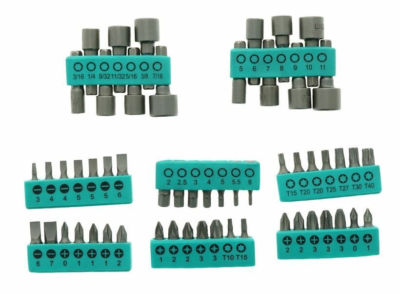 | Биты подробно | 1/4": T10, T15 (2 шт), T20 (2 шт), T25, T27, T30, T40, PH0, PH1 (3 шт), PH2 (3 шт), PH3 (3 шт), SL3, SL4 (2 шт), SL5 (2 шт), SL5.5,… SL6 (2 шт), SL7, H2, H2.5, H3, H4, H5, H5.5, H6, PZ0, PZ1 (2 шт), PZ2 (2 шт), PZ3 (2 шт) ещёскрыть |