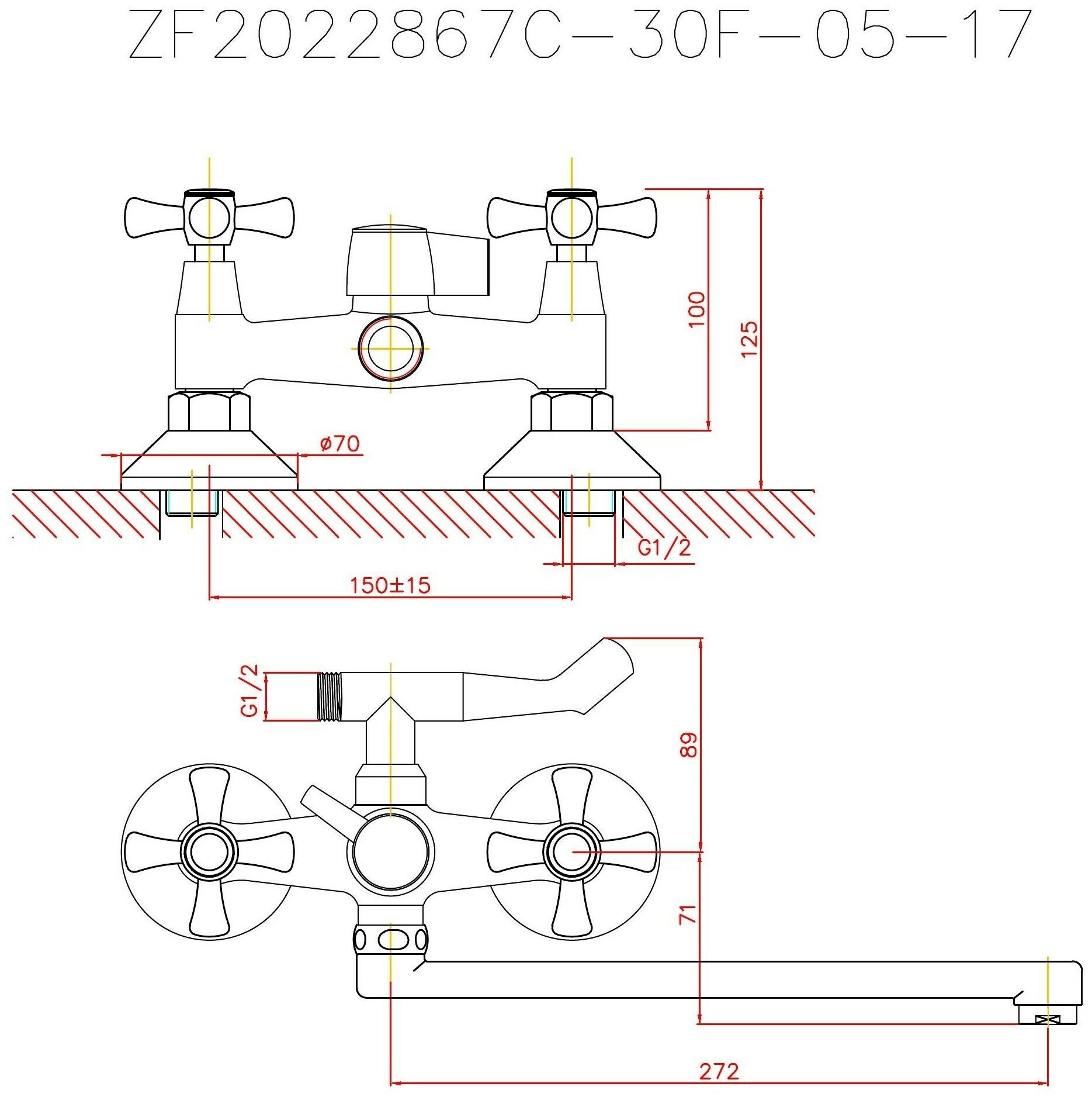 CRON Смеситель для ванны (Zn) плоский повор.излив 270мм,шаров.перек.в кор,двухвентельный,хром,CN2142
