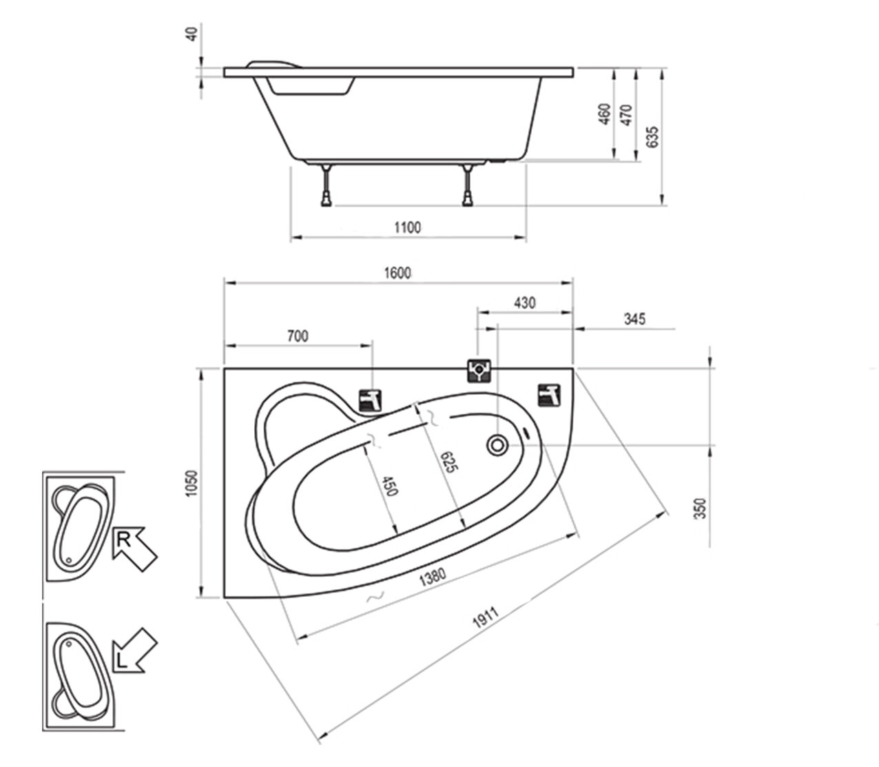 Ванна Ravak ASYMMETRIC 160x105см R белая (ножки CY44000000 отдельно)