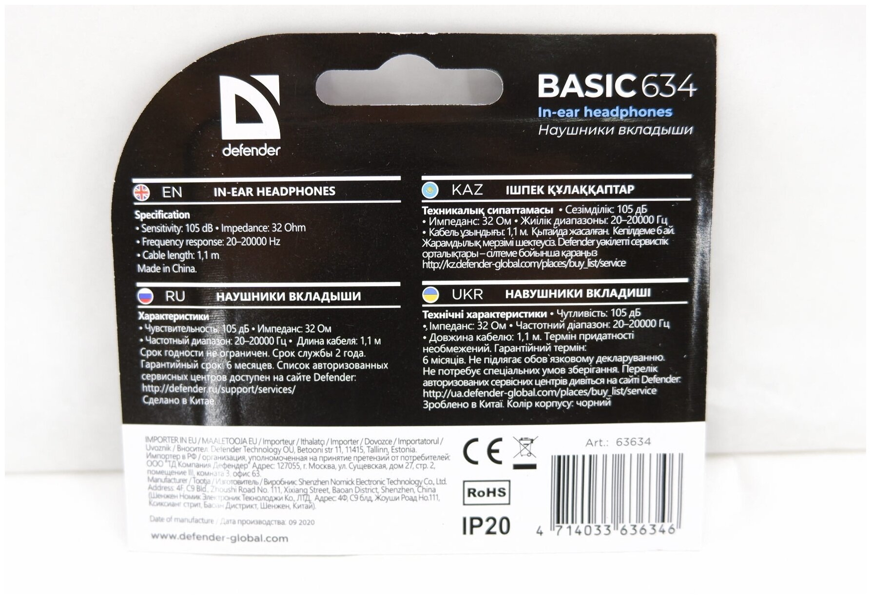 Наушники-вкладыши Defender Basic 634, 1,1м, черный ( Артикул 260495 )