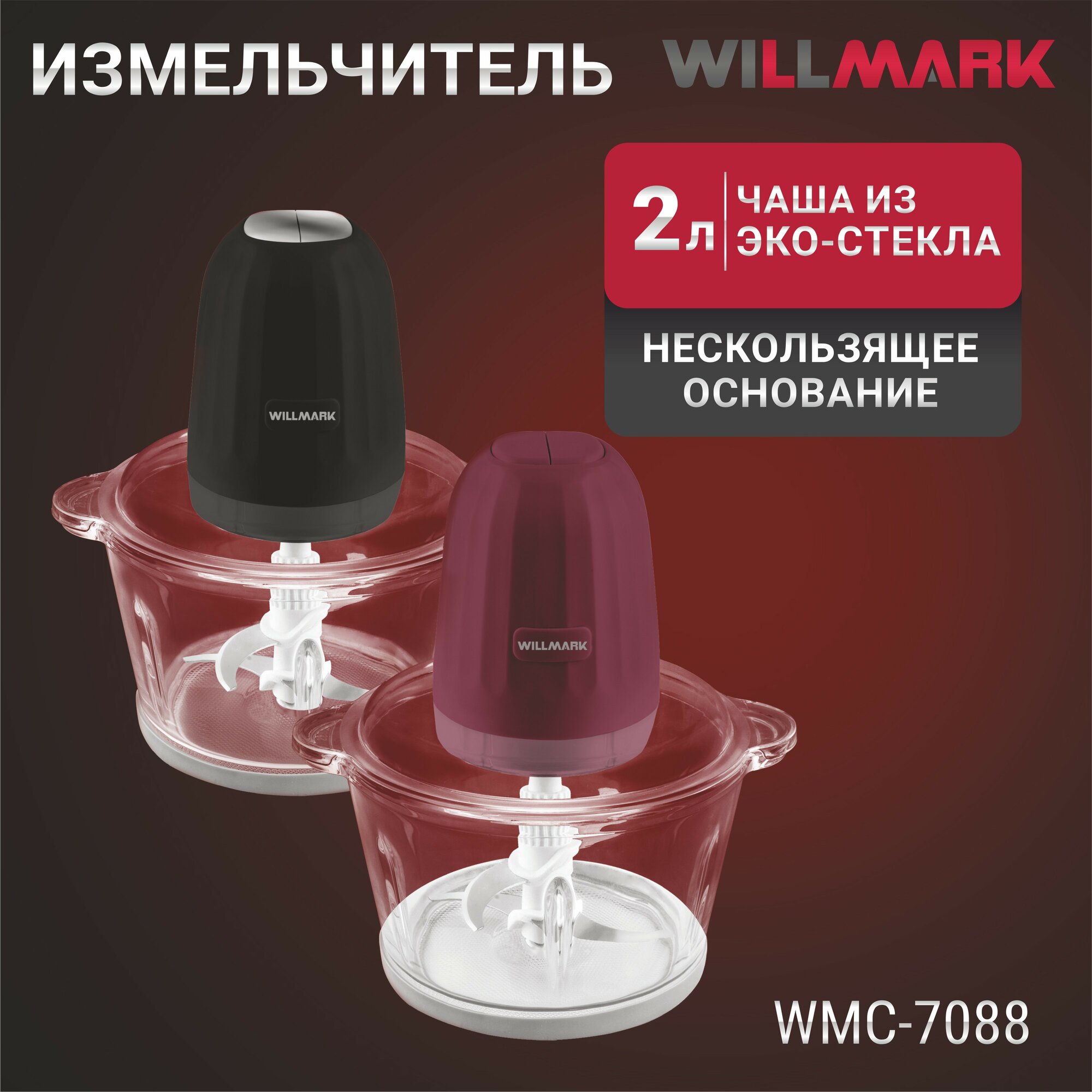 Измельчитель WILLMARK WMC-7088 (500Вт., стекл. чаша 2л., двойн. лезвия., рез. основание)