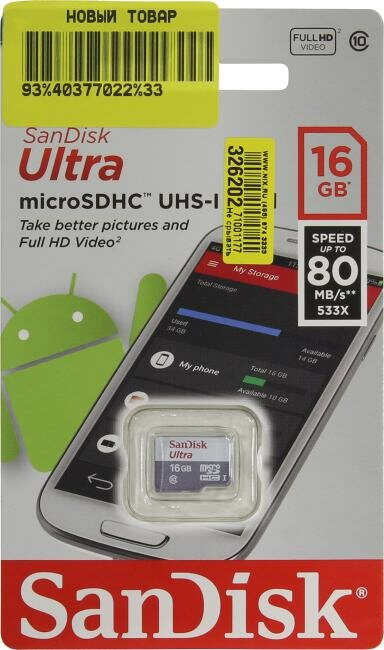 Карта памяти microSDHC UHS-I Sandisk Ultra 80 16 ГБ, 80 МБ/с, 533X, Class 10, SDSQUNS-016G-GN3MN, 1 шт.