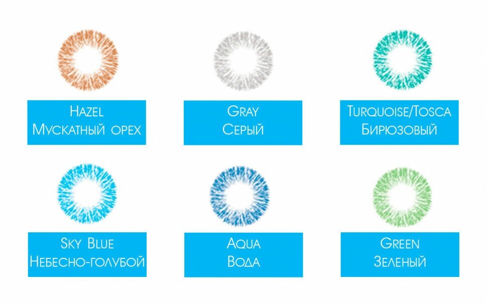 | Отзыв: | В целом хорошие, заказала васильковый, цвет на коробке Аква Блю. Мой карий цвет глаз перекрыли идеально. Думаю куплю ещё другие цвета. |