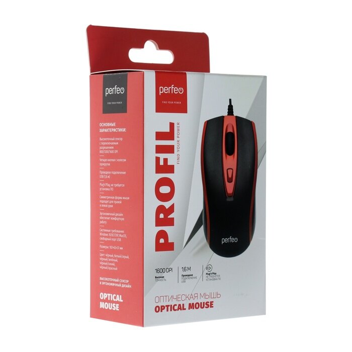 Купить Мышь Perfeo PROFIL, проводная, оптическая, 1600 dpi, USB,красная