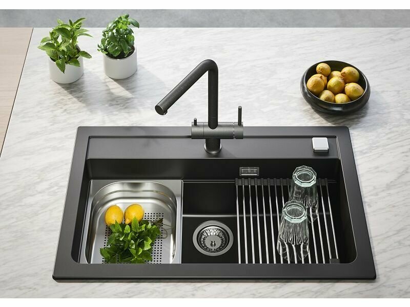 Мойка Alveus INTERMEZZO 130 CARBON-G91 780X480 X200, для кухни, раковина прямоугольная черная, мойка с сифоном комплект, искусственный гранит, мойка врезная, искусственный гранит
