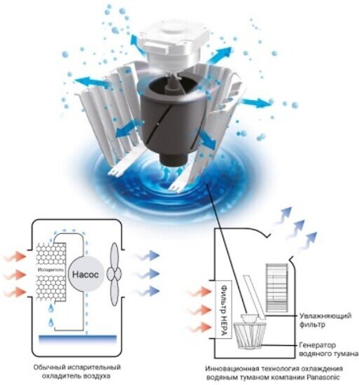 80-й комплекс Панасоника — пожалуй, самый мощный комплекс, который мне доводилось видеть. По сути, он работает, как адиабатический кондиционер плюс увлажнитель и очиститель воздуха. Система грамотная, распознает наличие загрязнений в окружающем воздухе сама!