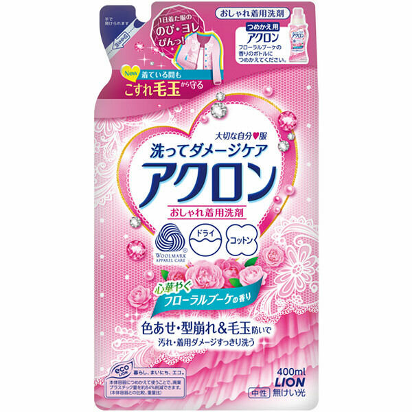 LION Жидкое средство для стирки ACRON деликатных тканей, шерсти, аромат цветов, 400 мл. сменная упаковка