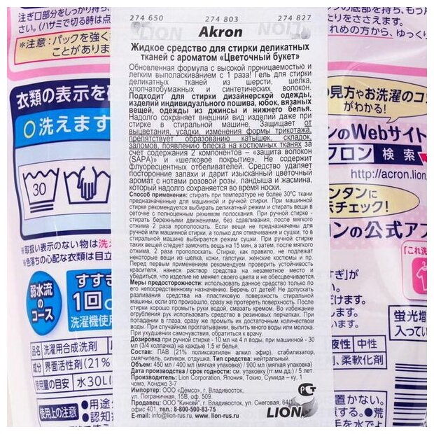 274650 Lion Acron Концентрированный гель для стирки деликатных тканей и изделий из шерсти, аромат цветов, 450 мл