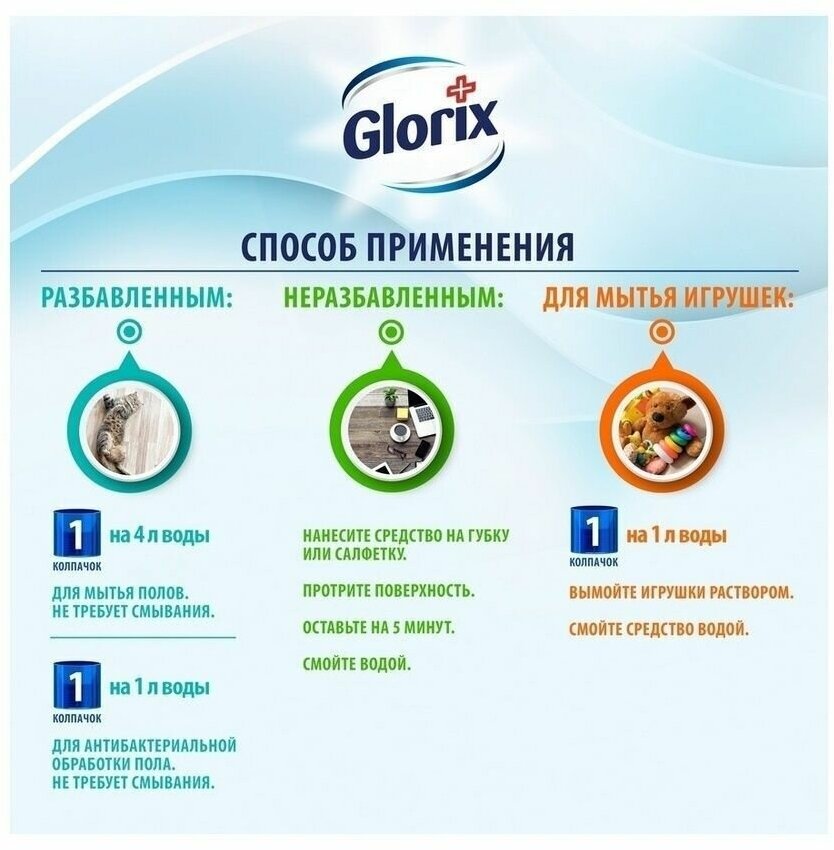 Средство для мытья пола дезинфицирующее 1 л GLORIX (Глорикс) "Лимонная Энергия", без хлора, 8677296