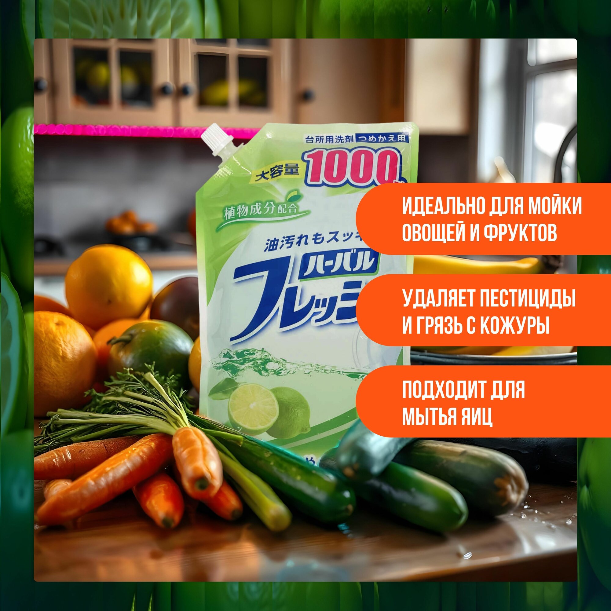 Mitsuei Средство для мытья посуды, овощей и фруктов с ароматом лайма 1000 мл в мягкой упаковке