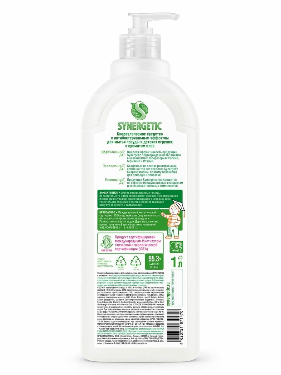 Средство для мытья посуды и детских игрушек SYNERGETIC биоразлагаемое с ароматом алоэ, 1л