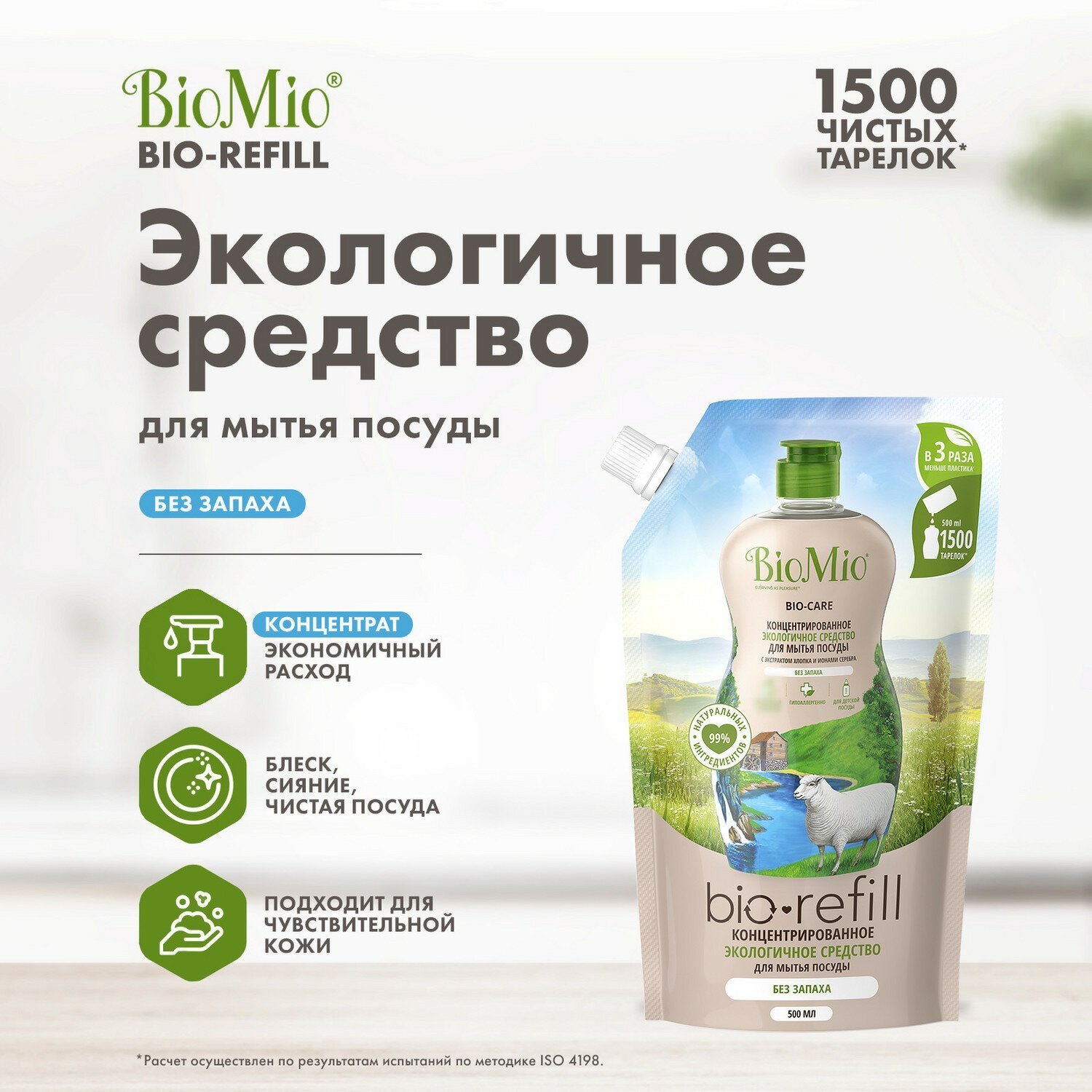 Экологичное средство для мытья посуды BioMio BIO-CARE REFILL с экстрактом хлопка и ионами серебра. Концентрат. Без запаха 500 мл.