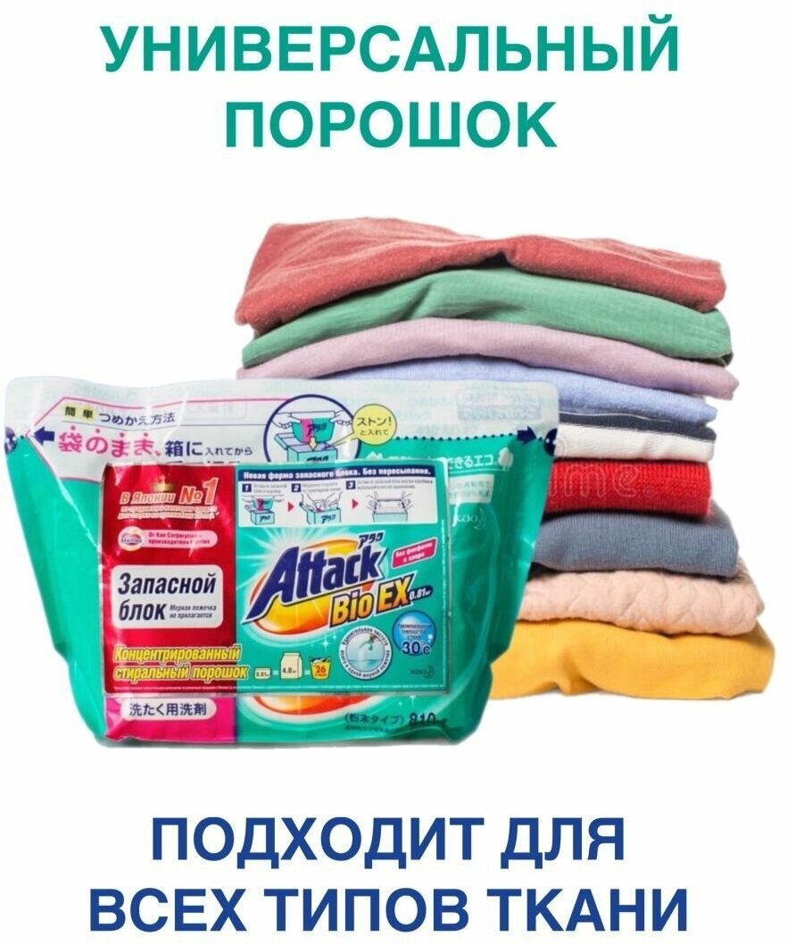 Концентрированный стиральный порошок Attack BioEX для белых, цветных и темных тканей, запасной блок 810 г