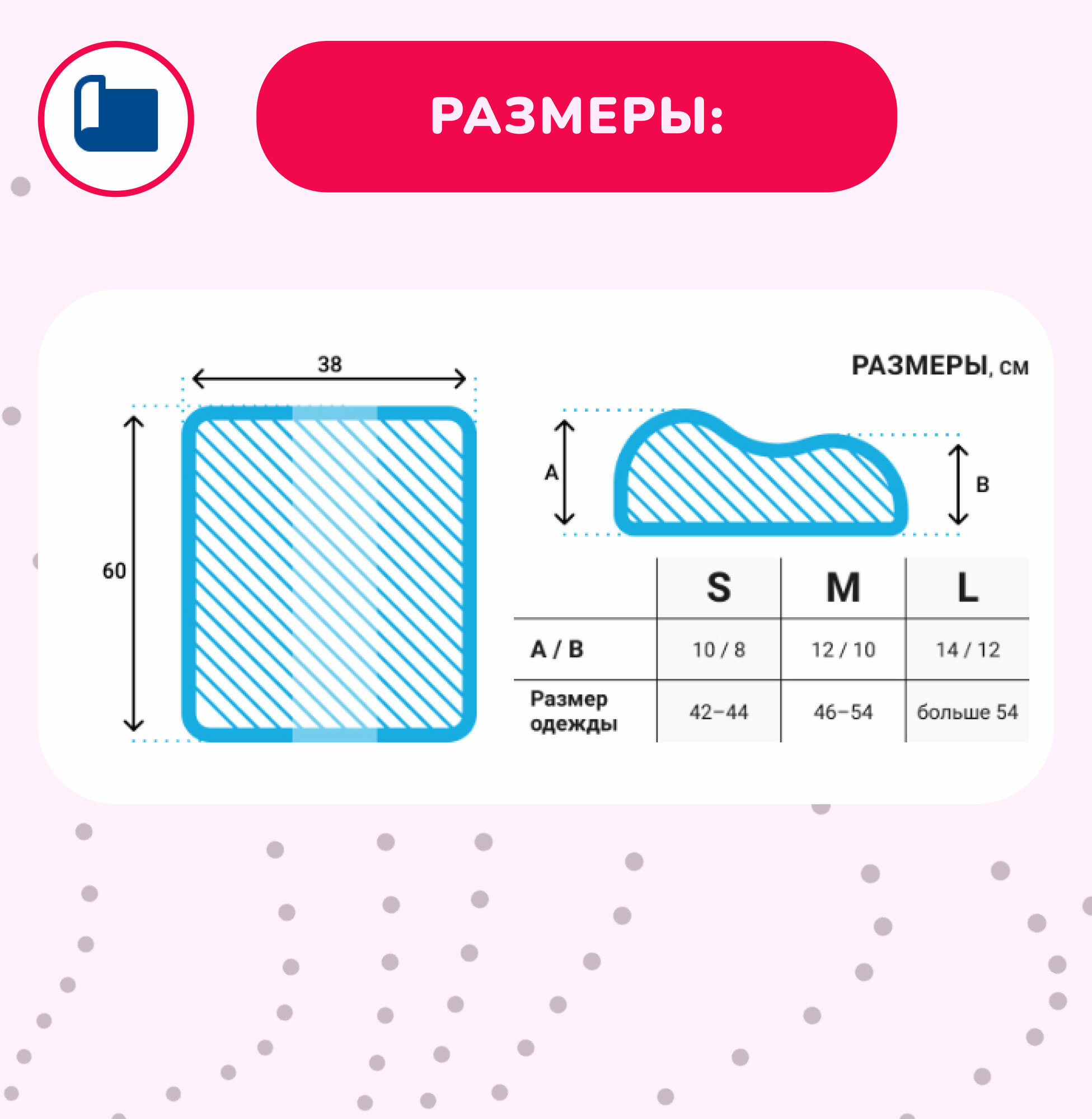 | Минусы: | В описании написано: Размер подушки подбирают согласно размеру одежды: Размер одежды более 54 -размер подушки L (38x60x(10)12 см)