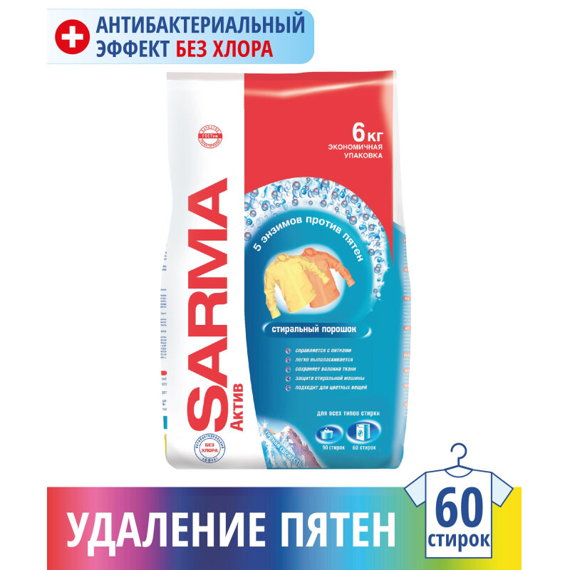 Порошок стиральный SARMA Актив для любого вида белья аромат горная свежесть для всех типов стирки 6кг / моющее средство