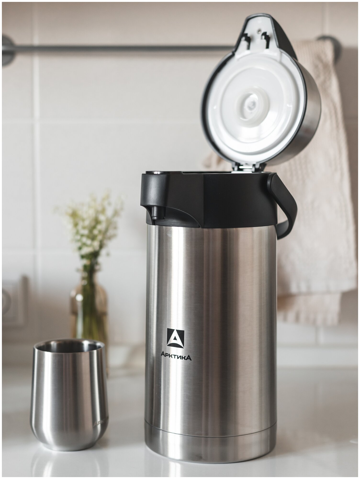 Термос для чая и кофе с помпой Арктика 501-2500 серебристый 2,5 литра настольный вакуумный с пневмонасосом и ручкой для переноски