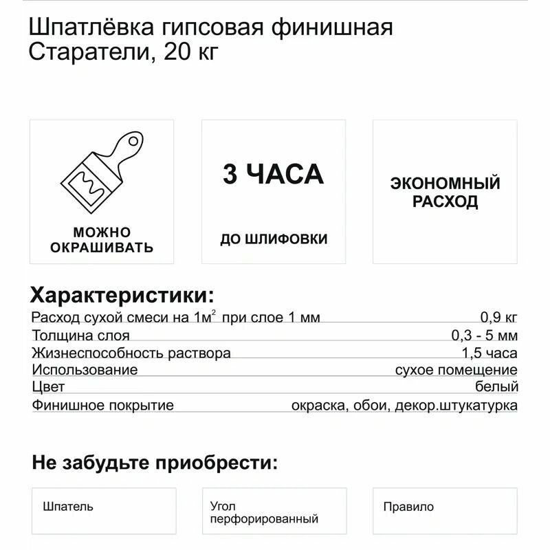 Старатели Финишная шпаклевка гипсовая (20кг) / старатели Финишная шпатлевка гипсовая белая (20кг)