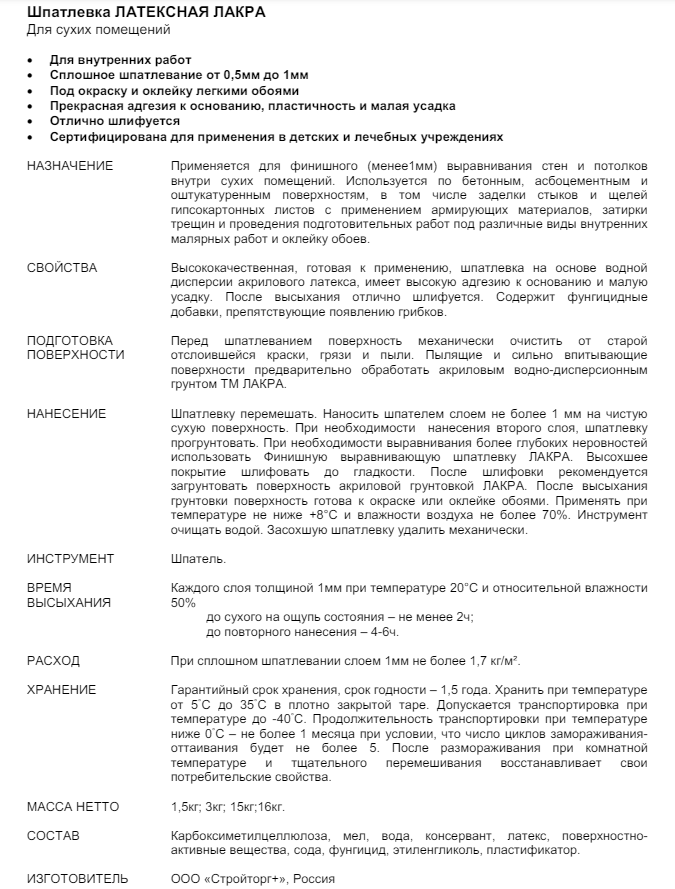 Латексная шпатлевка для внутренних работ лакра Лк-00003808