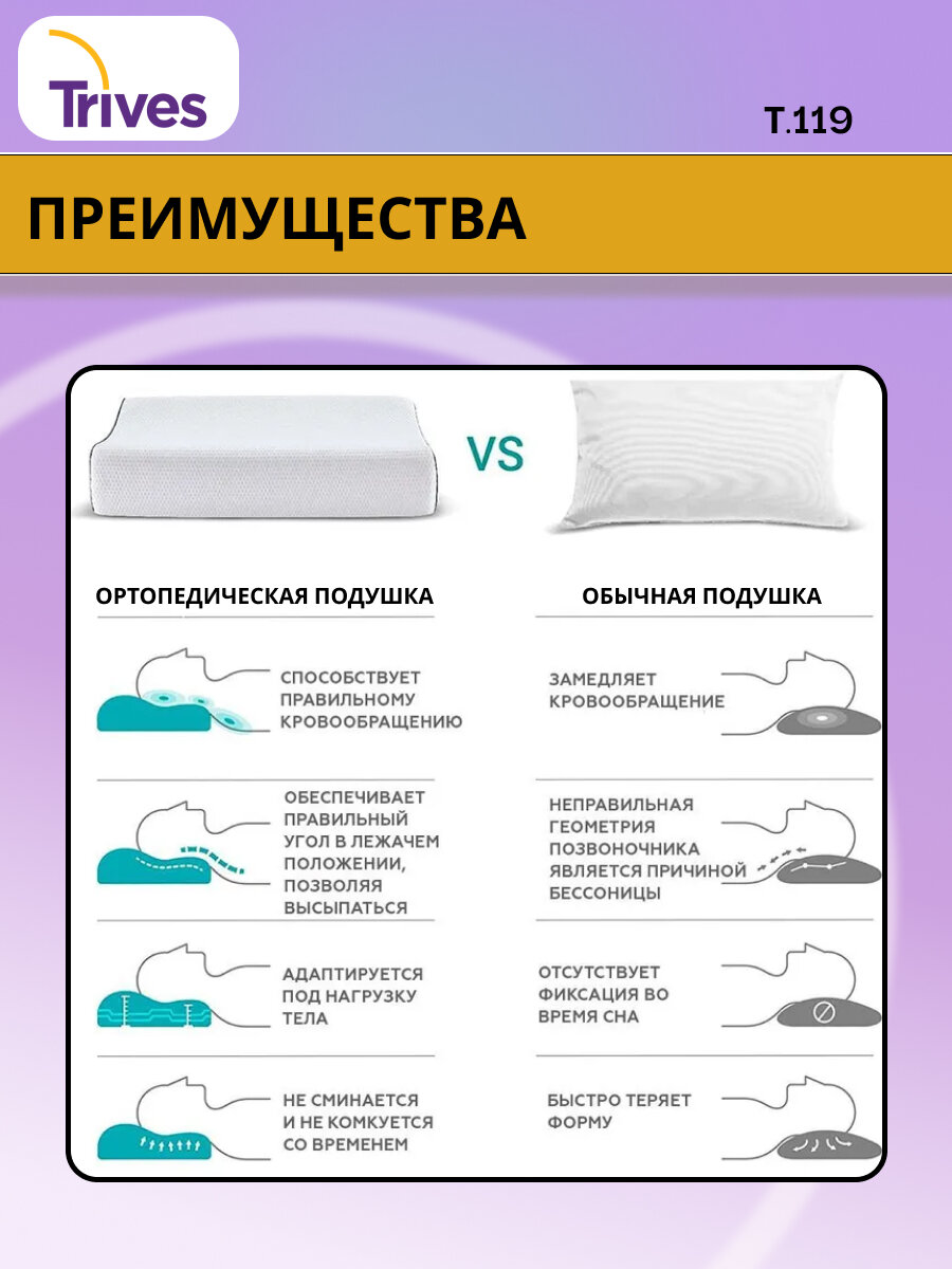 Ниже Вы можете прочитать отзывы на Ортопедическая подушка Тривес Т.119 (ТОП-119) с эффектом памяти L, ознакомится с подробными характеристиками, посмотреть интересные обзоры и фотографии на Ортопедическая подушка Тривес Т.119 (ТОП-119) с эффектом памяти L.