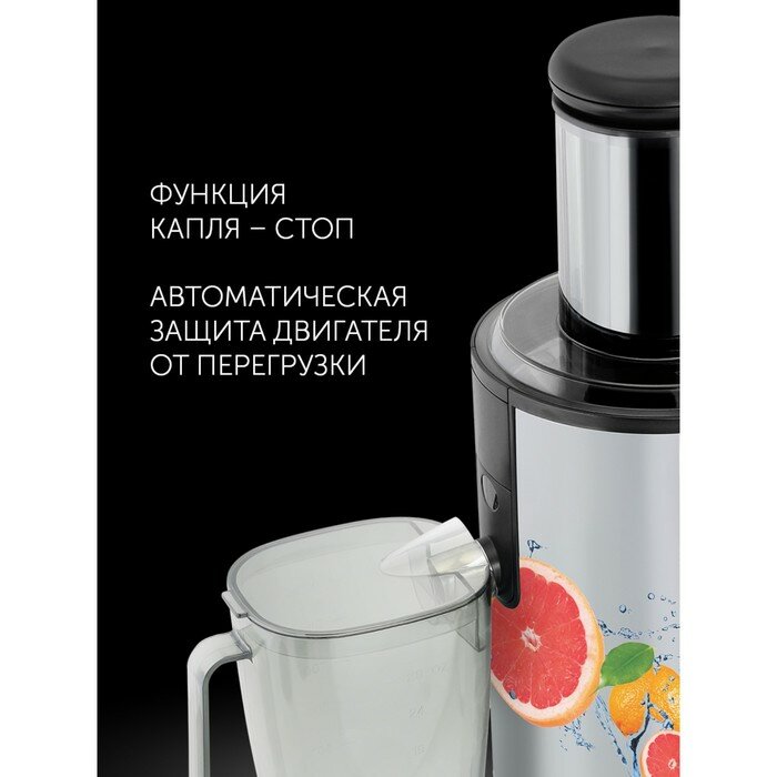 | Плюсы: | Отличный отжим, жмых почти сухой. Хорошая мощность. Есть противокапельная система и специальный стакан для сока на 1 л. |