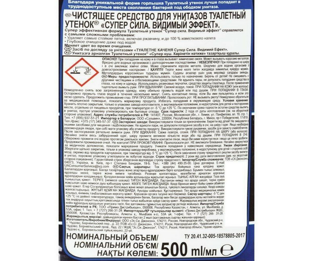 Средство для уборки туалета туалетный утенок Супер Сила Видимый Эффект 500 мл 696888 605505