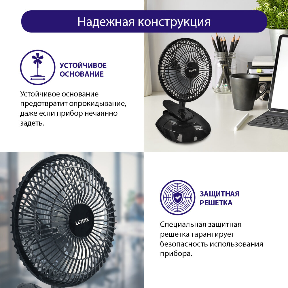 Вентилятор настольный и прищепка LUMME LU-109, диаметр 15 см, 20 Вт, черный