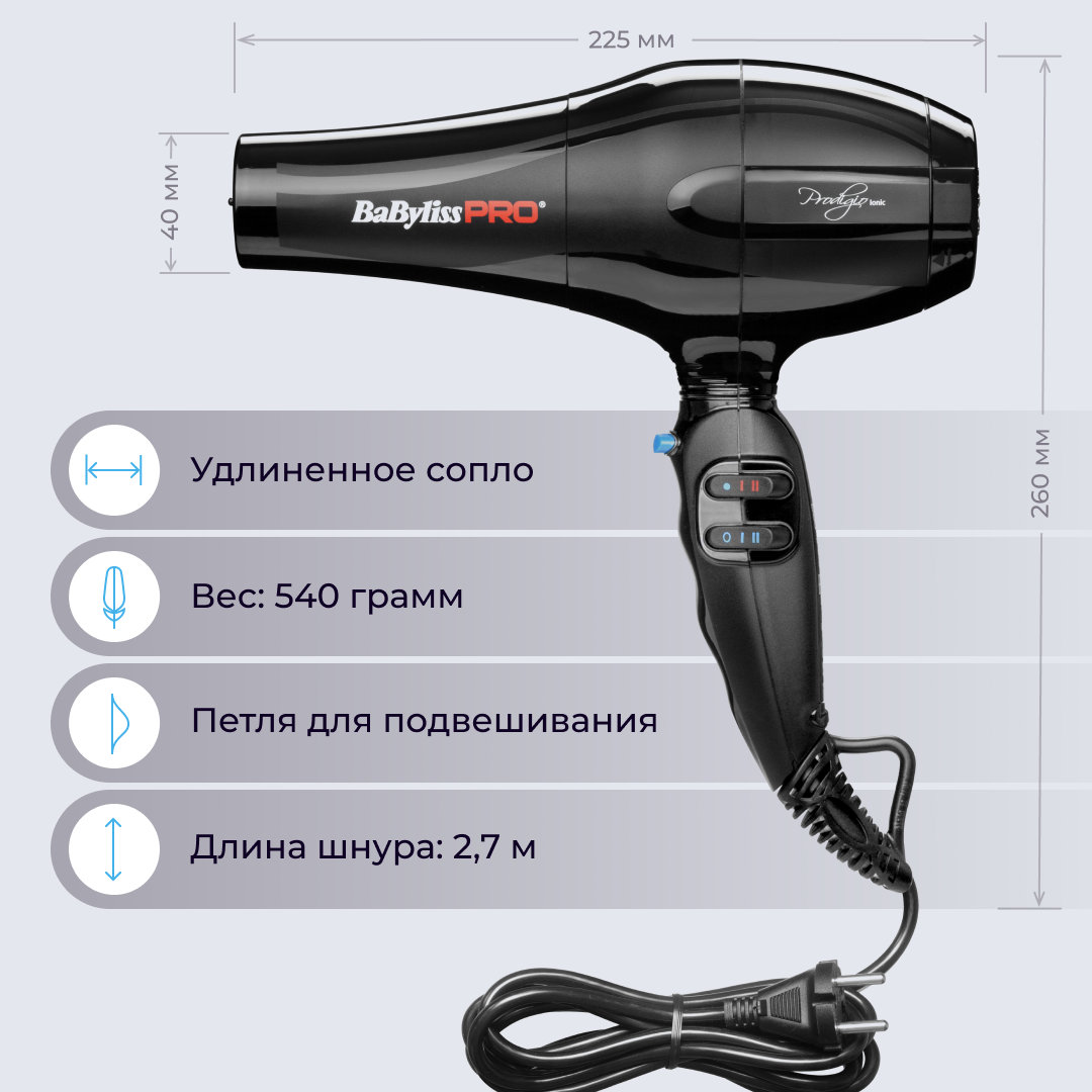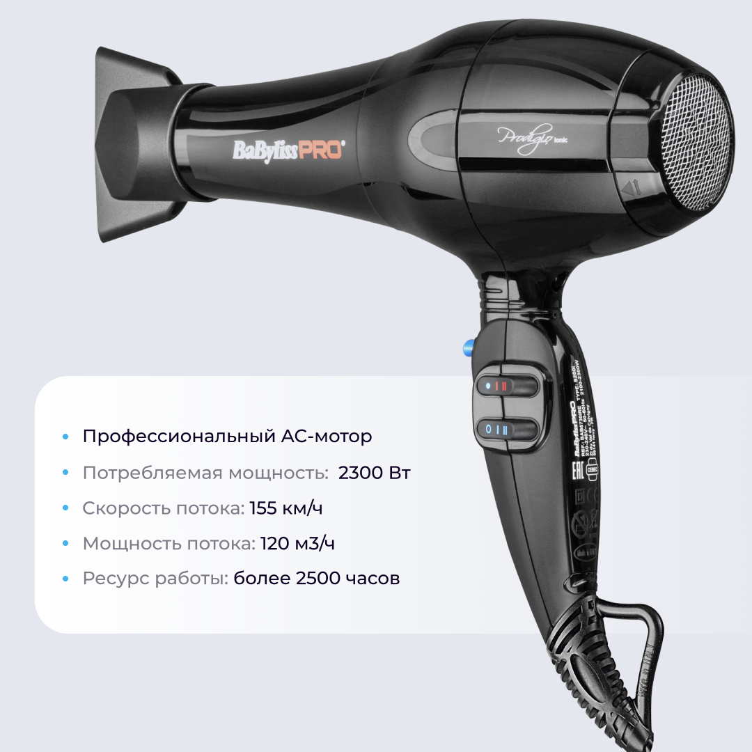 Фен BaByliss Pro Prodigio, 2300Вт, ионизация, 2 насадки BAB6730IRE