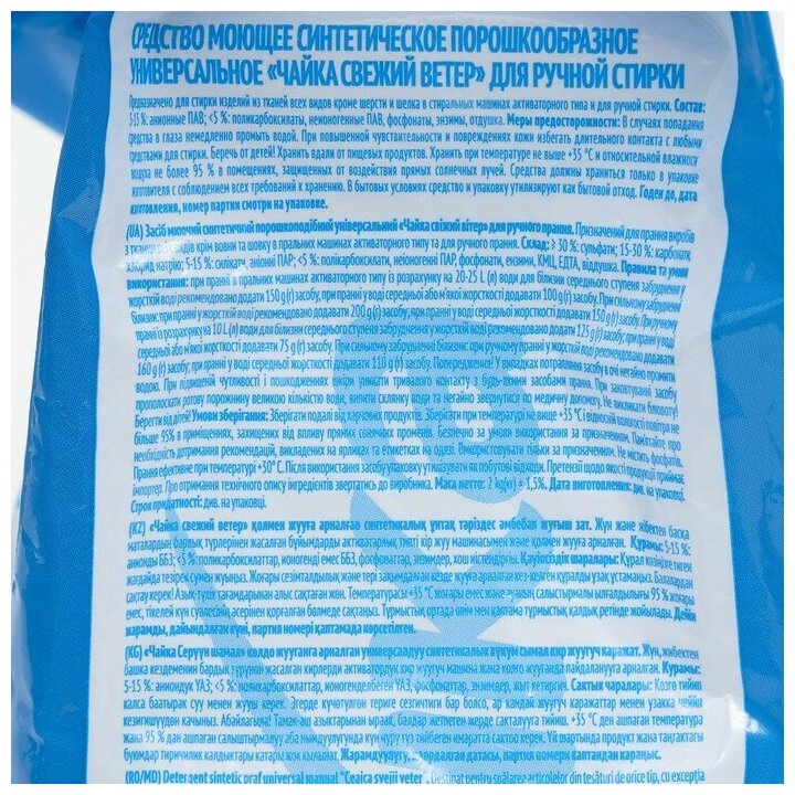Порошок стиральный Чайка для любого вида белья аромат свежий ветер ручная стирка 2кг / моющее средство