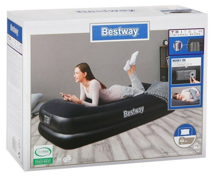 Надувная кровать BESTWAY 97х191х46см с подголовником, встр.насос 220В, до 150кг, уп.2