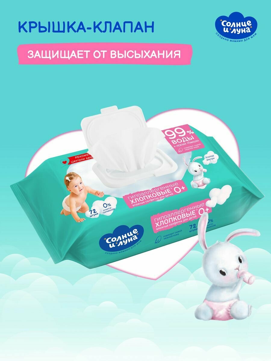 Детские влажные салфетки Солнце И Луна с отваром ромашки, 72 шт