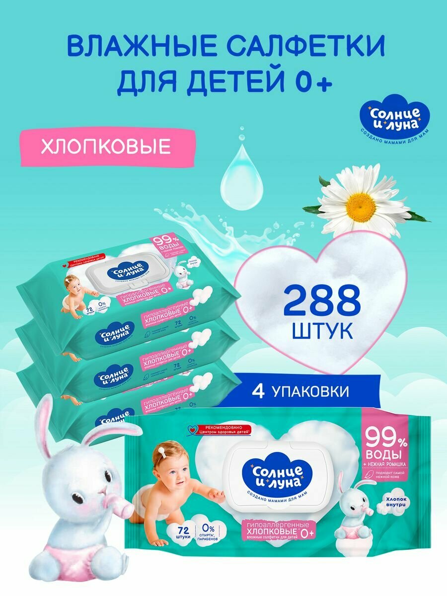 Влажные салфетки детские ромашка и хлопковое молочко 864 шт (72 шт х 12) солнце И луна
