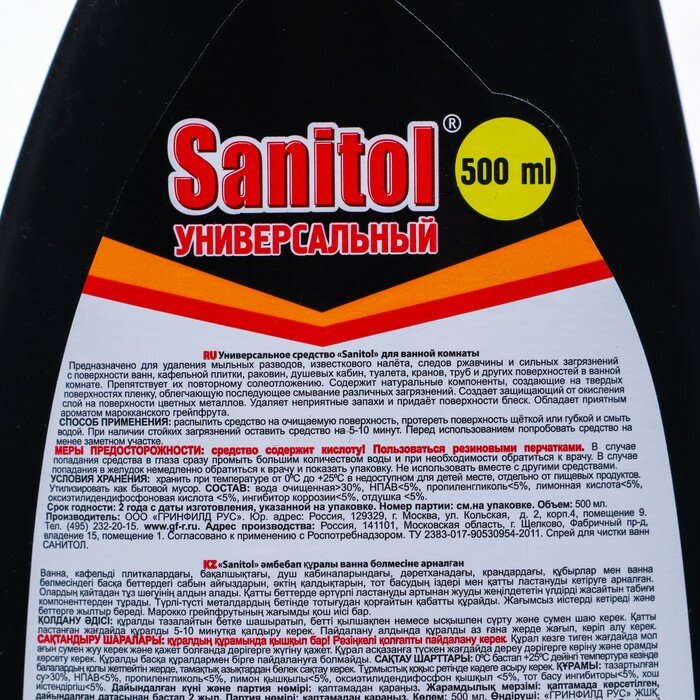 Средство универсальное для удаления известкового налета, мыльных разводов и ржавчины SANITOL 500мл