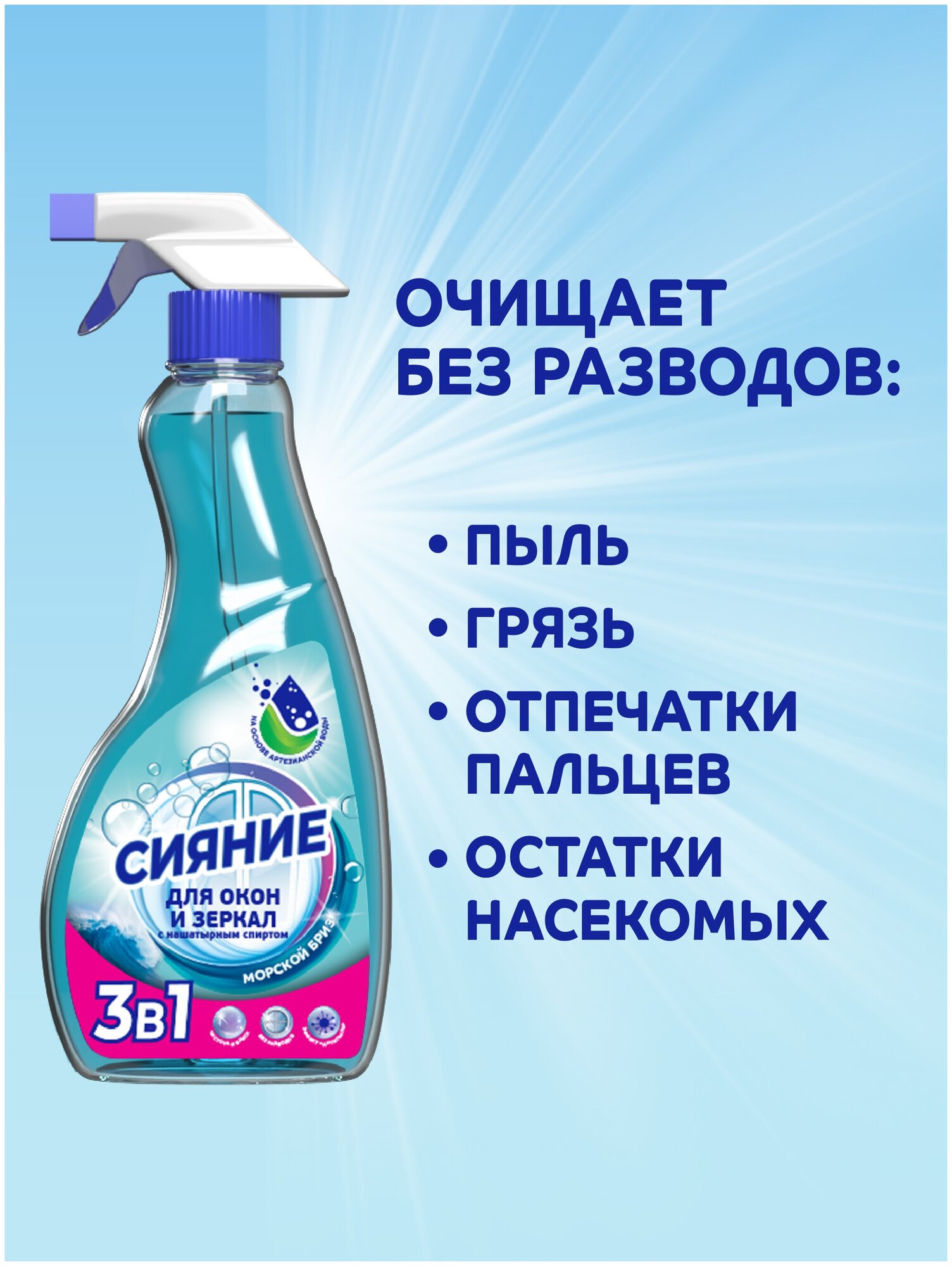 Стеклоочиститель сияние 500мл Морской бриз 3в1 с нашатырным спиртом для стекол триггер