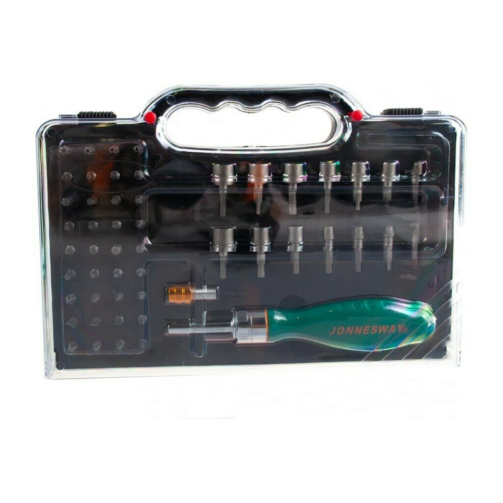 JONNESWAY DR0152S Рукоятка отверточная трещоточная в наборе с битами и насадками, 52 предмета