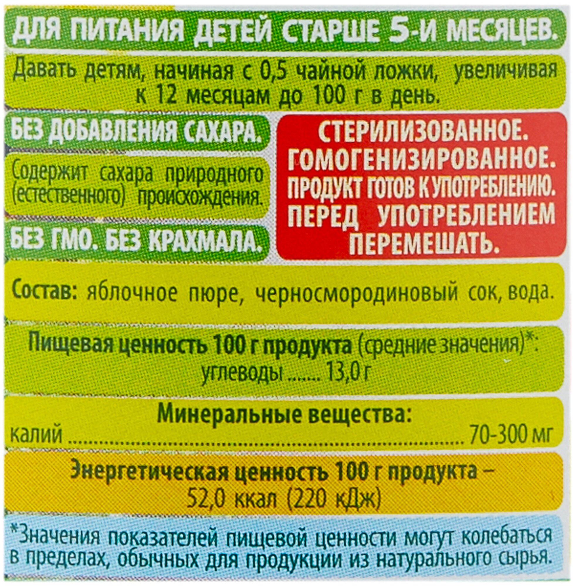| Отзыв: | Впервые увидела пюре со смородиной. Вкус мягкий, у ребёнка не было аллергии на это питание. Баночку ребёнок съел за раз с аппетитом, такое бывает не всегда. Буду покупать ещё однозначно. |