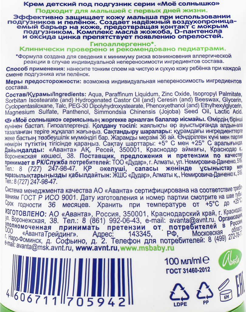 Аванта Детский крем под подгузник Моё Солнышко 100 мл
