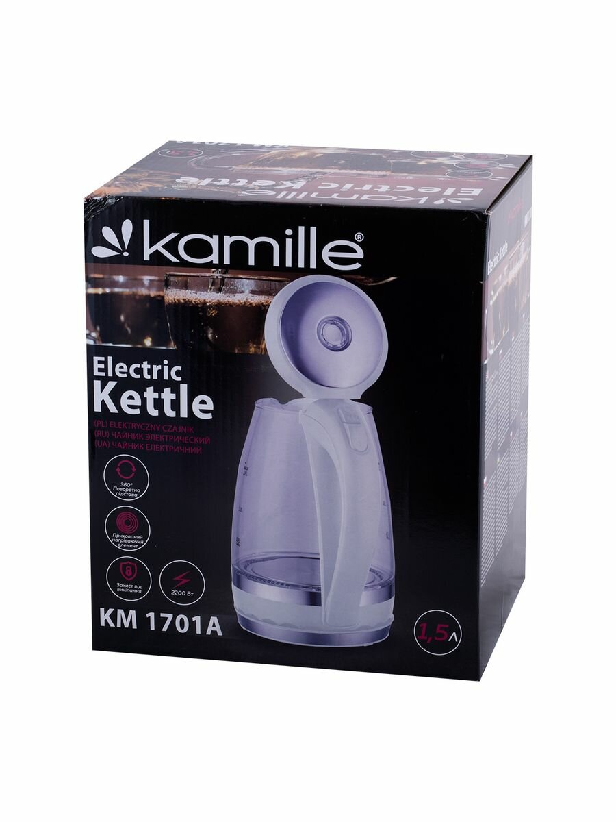 Чайник электрический 1,5 л. стеклянный Kamille KM-1700B (черный) с синей LED подсветкой (1,5 л. / черный)