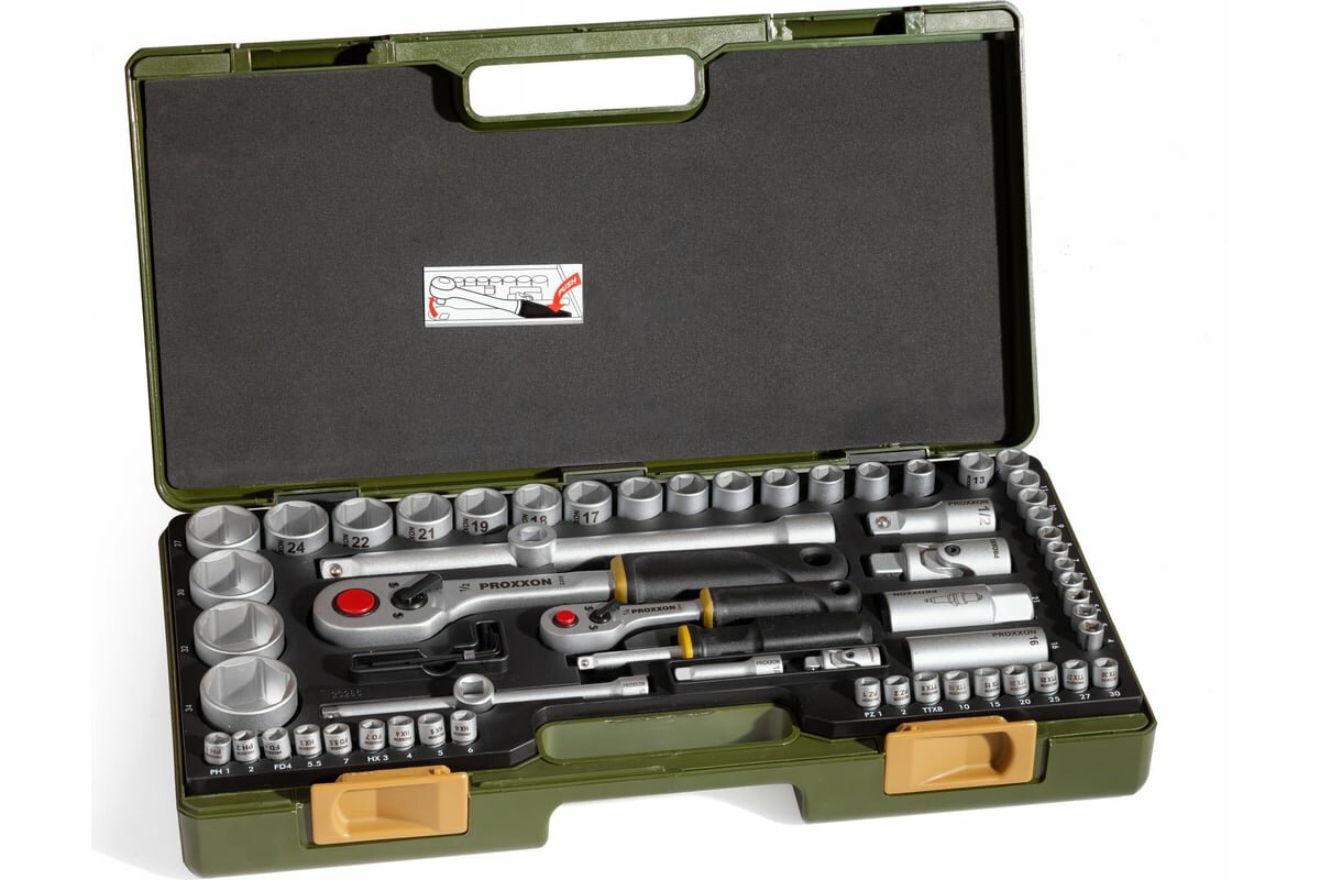 Полный комплект Proxxon с флажковыми трещотками, большой и средней на 1/4" и на 1/2" (65 предметов)