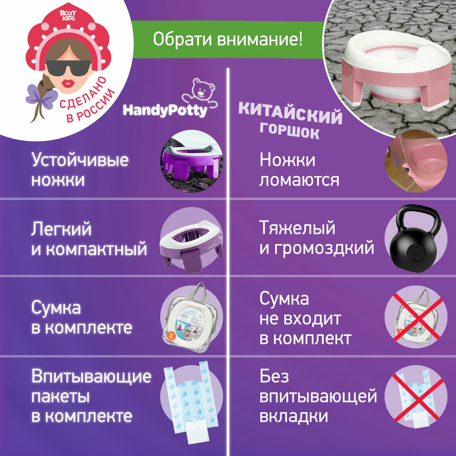 Горшок складной дорожный и насадка на унитаз HandyPotty от ROXY-KIDS с тремя пакетами, цвет лиловый