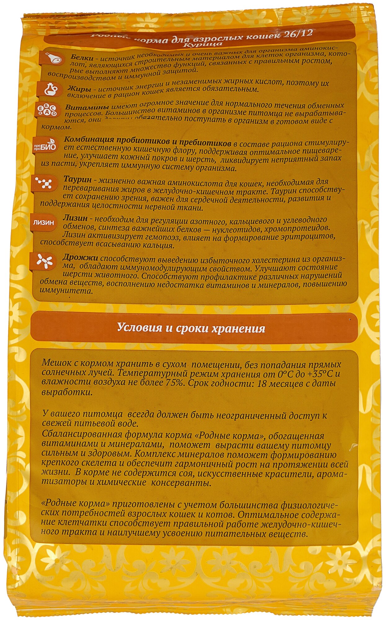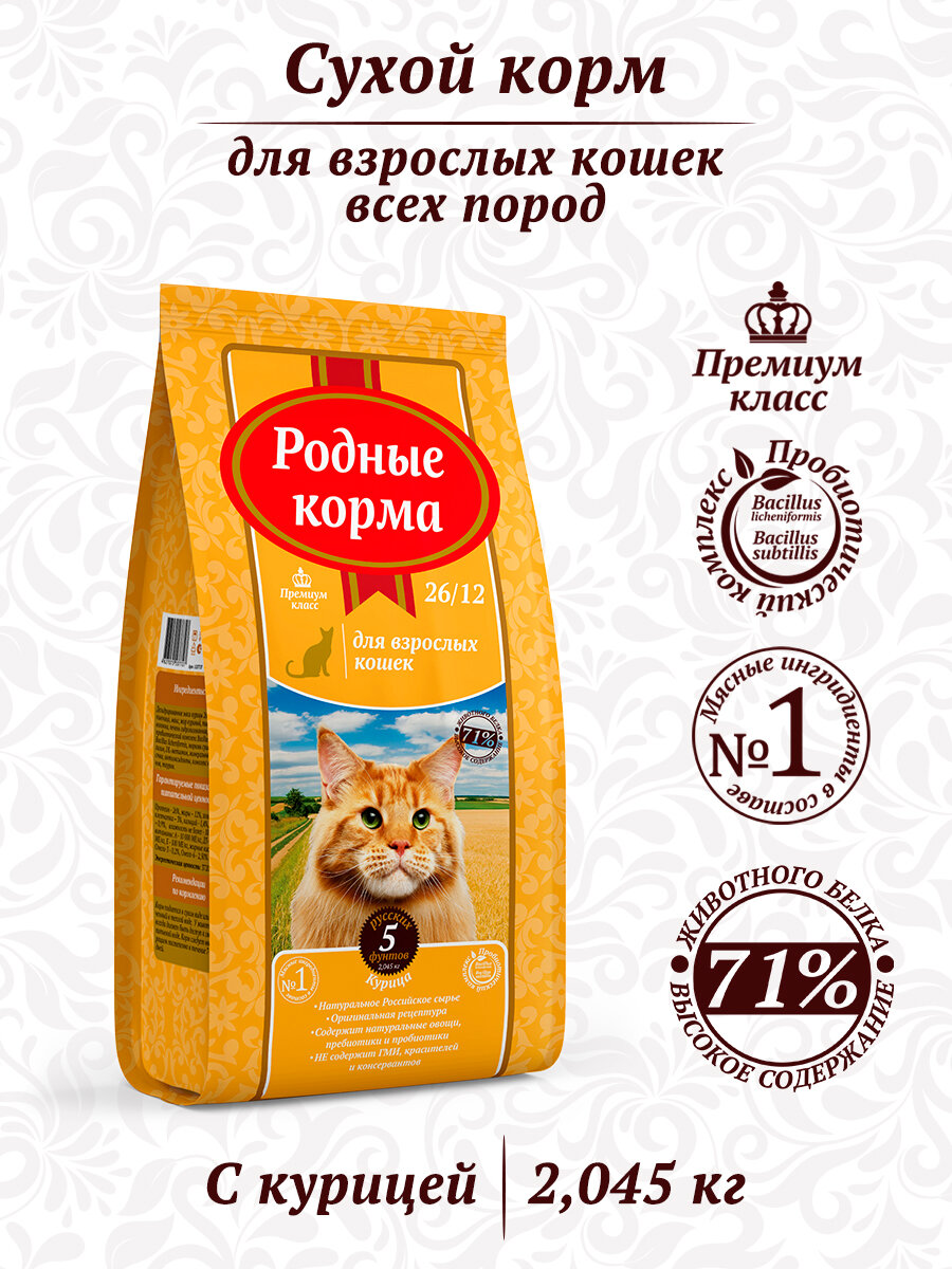 Родные корма сухой корм для взрослых кошек курица 26/12 5 русских фунтов (2,045 кг)