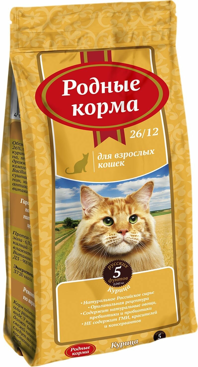 Корм сухой Родные Корма 26/12 5 русских фунтов для взрослых кошек, с курицей 2,045 кг